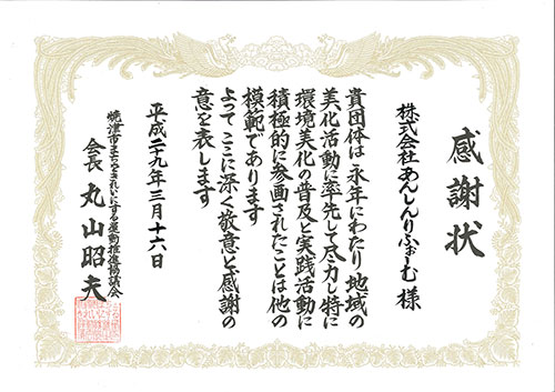 平成21年より焼津市西小川に本社(株式会社あんしんりふぉーむ 旧 株式会社ハウスメンテ 静岡・焼津)を構え、 会社周辺のゴミ拾いを8年間、ほぼ毎日継続し行ってきたことを地域の方に評価していただき、平成29年3月に焼津市まちをきれいにする運動推進協議会様より感謝状を頂きました。